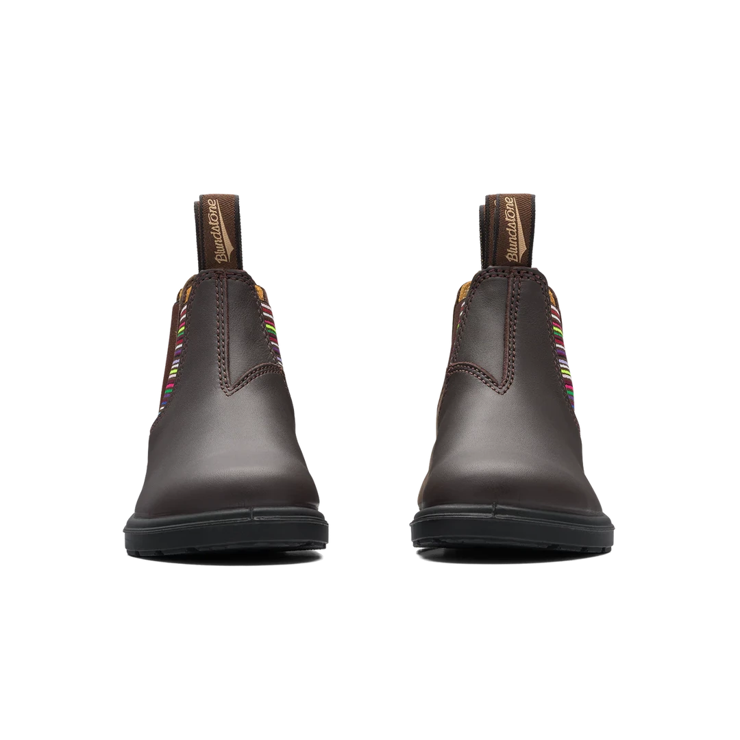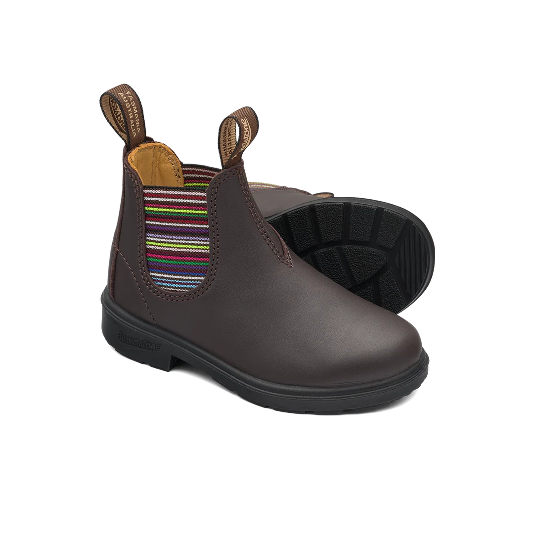 Blundstone 1413 Kids Chelsea in Brown with Striped Elastic is colourful fun and Blundstone comfort for little feet. No-lace freedom gives kids footwear independence. Moms, dads, and teachers, too. Removable insoles for months more wear.