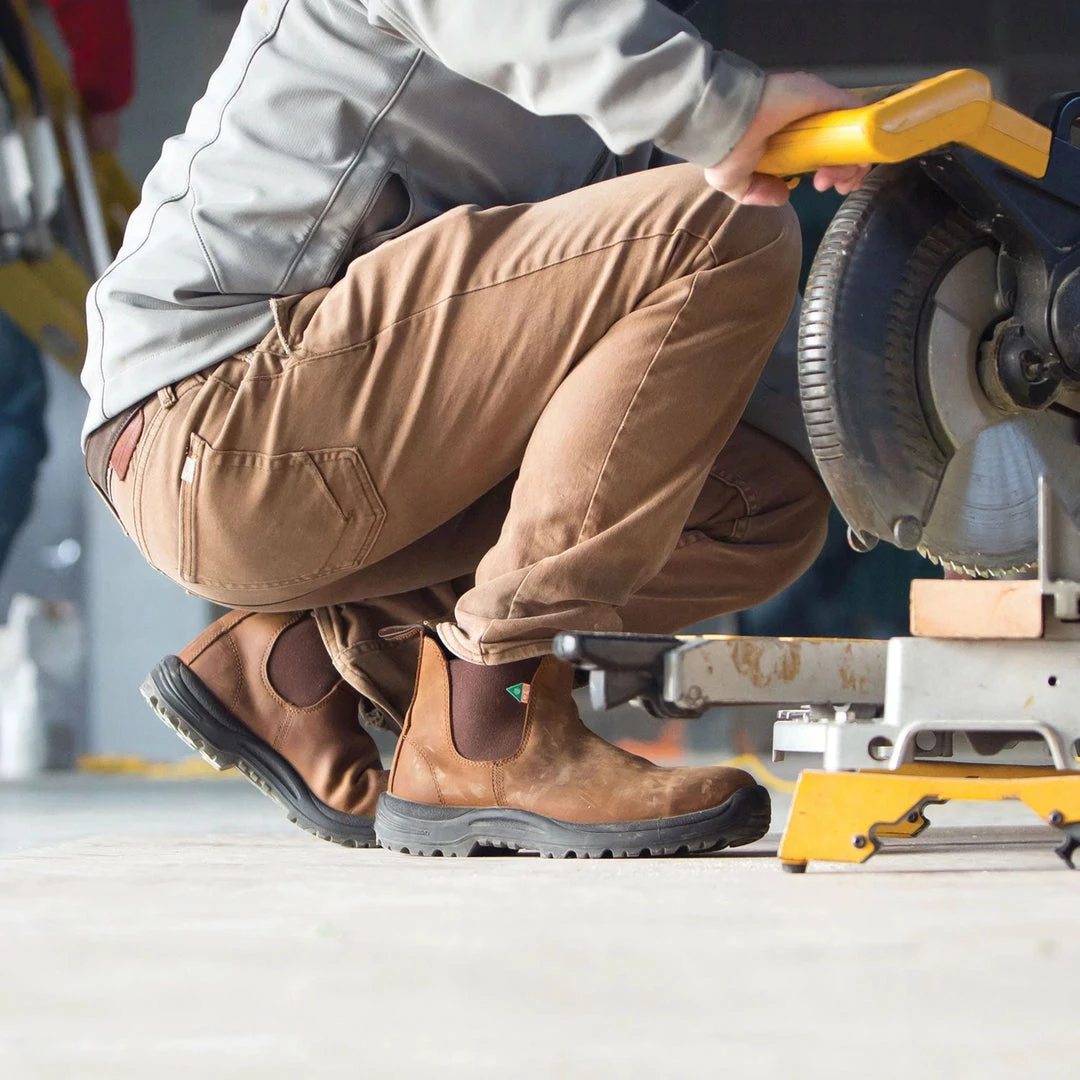 This work boot checks all the safety boxes so you can focus on the job at hand. Blundstone protective steel toe safety and dry all-day comfort, even on concrete. Flexible, comfortable and pull-on, kick-off easy to keep mud and debris off car mats, indoor carpets and new floors. Lightweight and durable with a sole resistant to electrical, chemical and acid dangers. CSA approved.