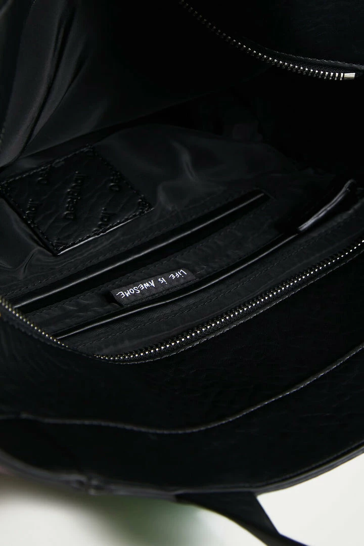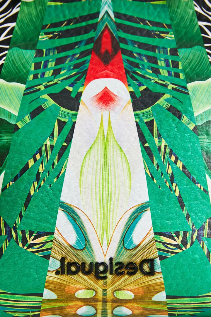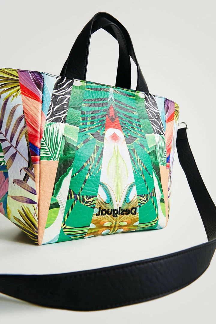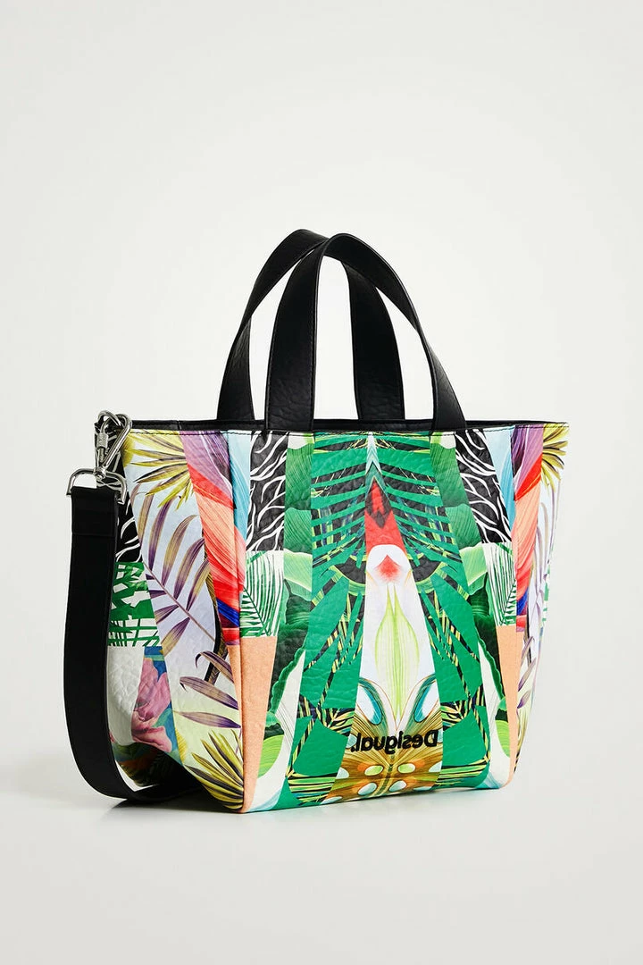 A medium shopper made from faux leather, it is very soft and features a digital patchwork print in an arty jungle style in green tones. With a double strap, for carrying or wearing as a sling.