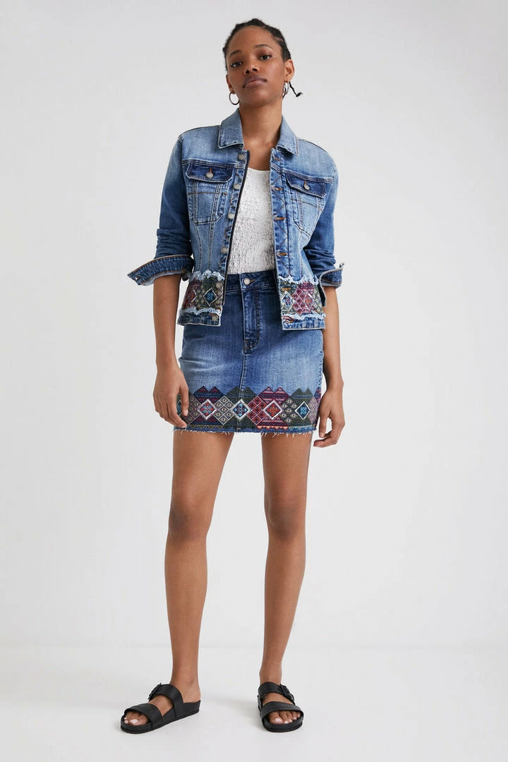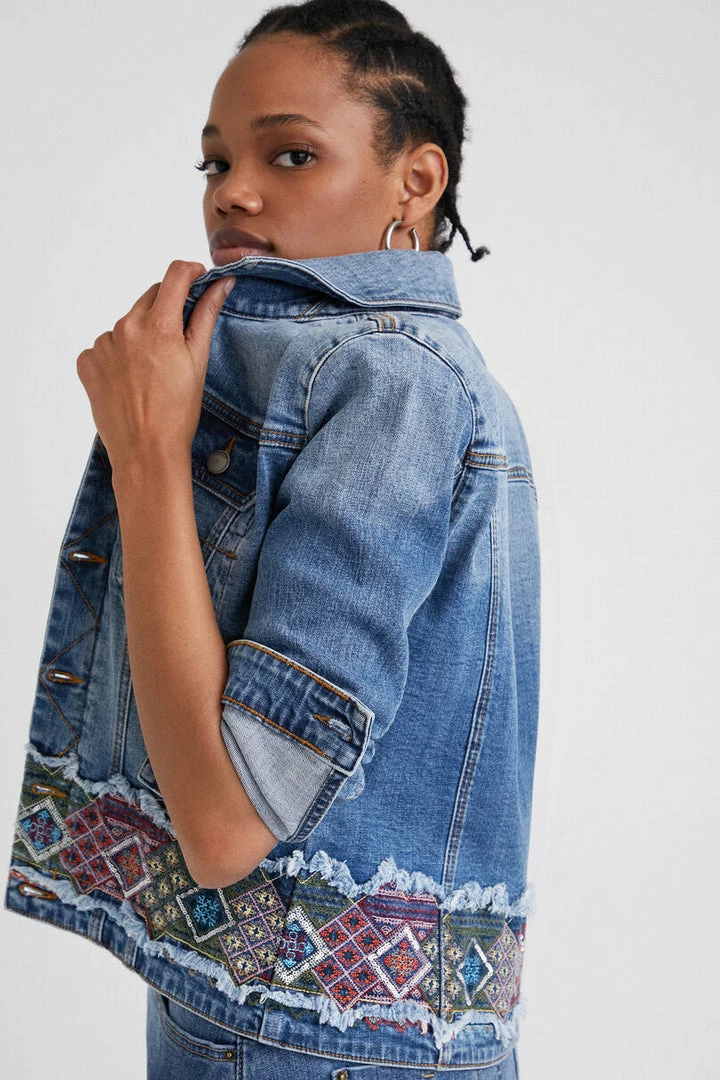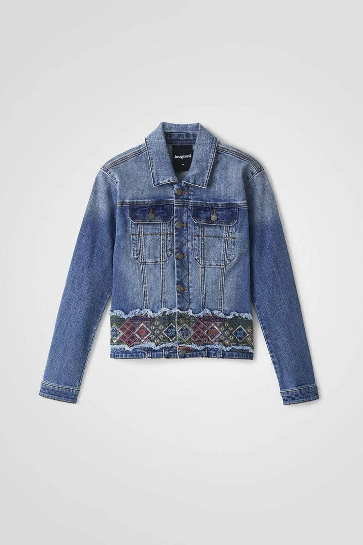 Borders reminiscent of Asian rugs decorate the hem of this close-fitting denim jacket made from sustainable cotton. Decorative backstitching on the placket with a zip closure and ornamental buttons.