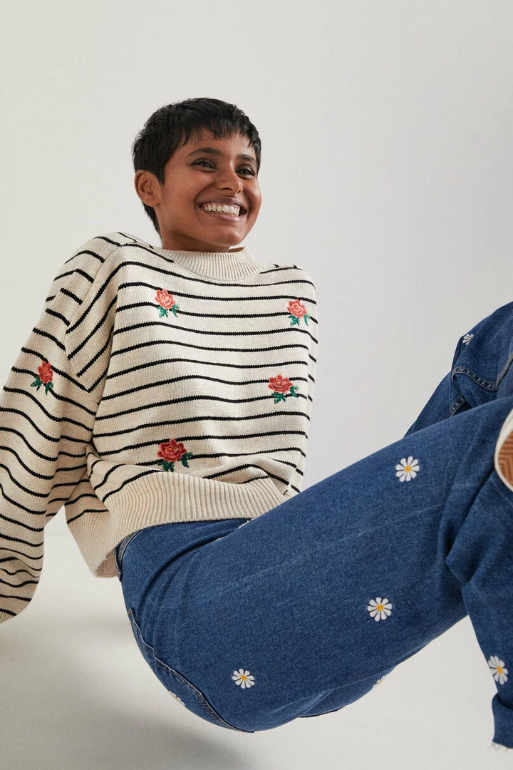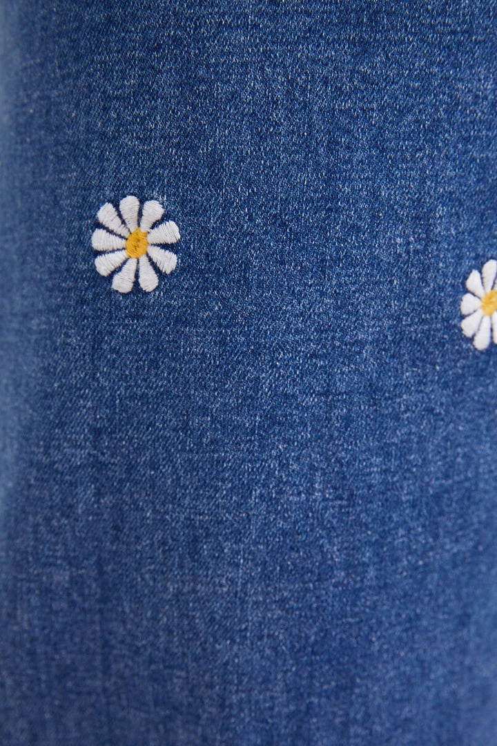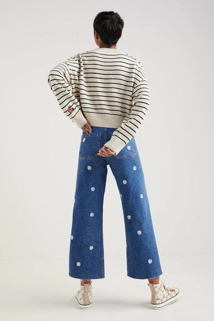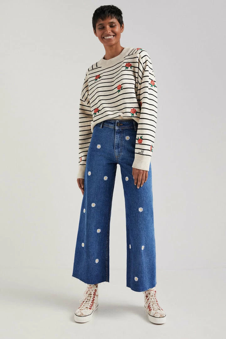 These denim culottes covered in embroidered white daisies are gently elasticated so they fit you like a glove. High-waisted with raw-cut hems and made from sustainable cotton.