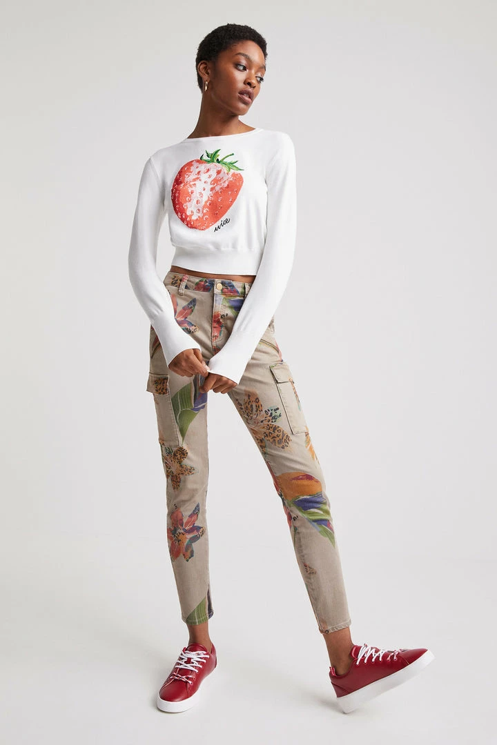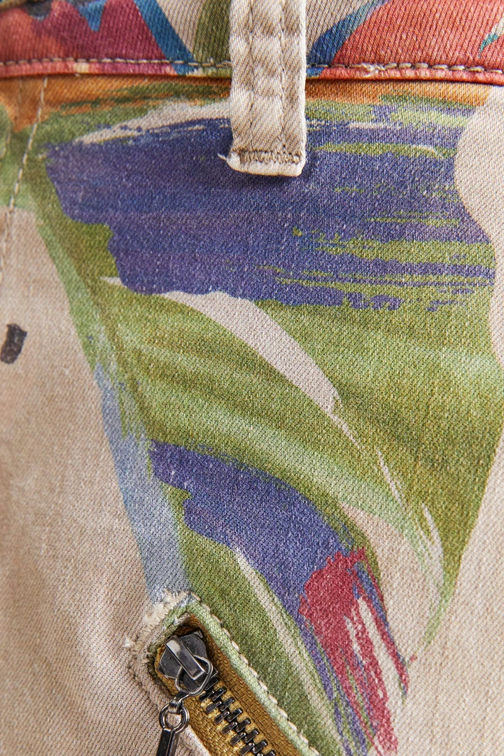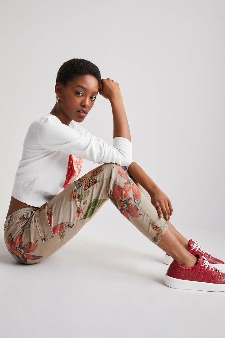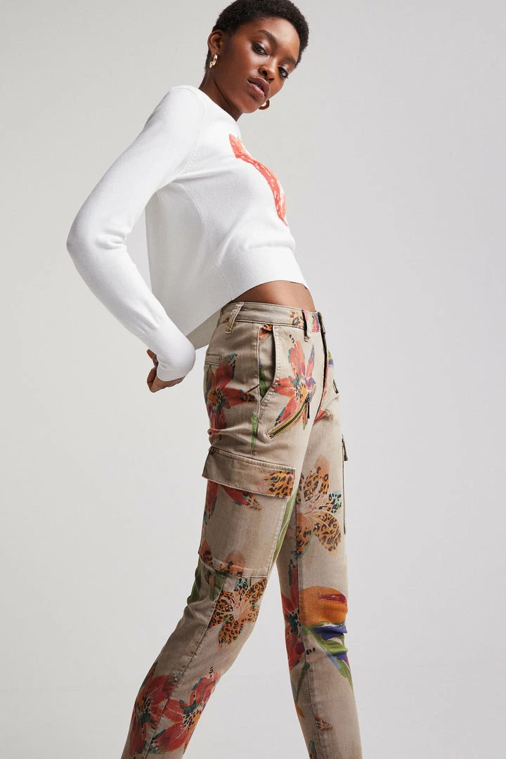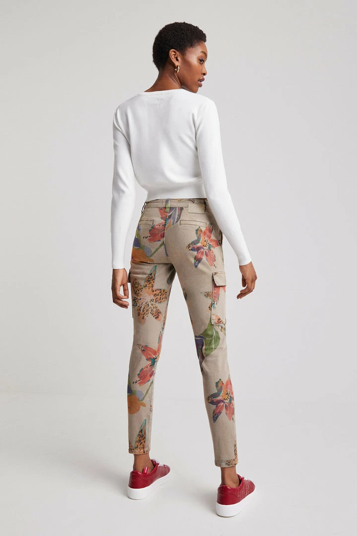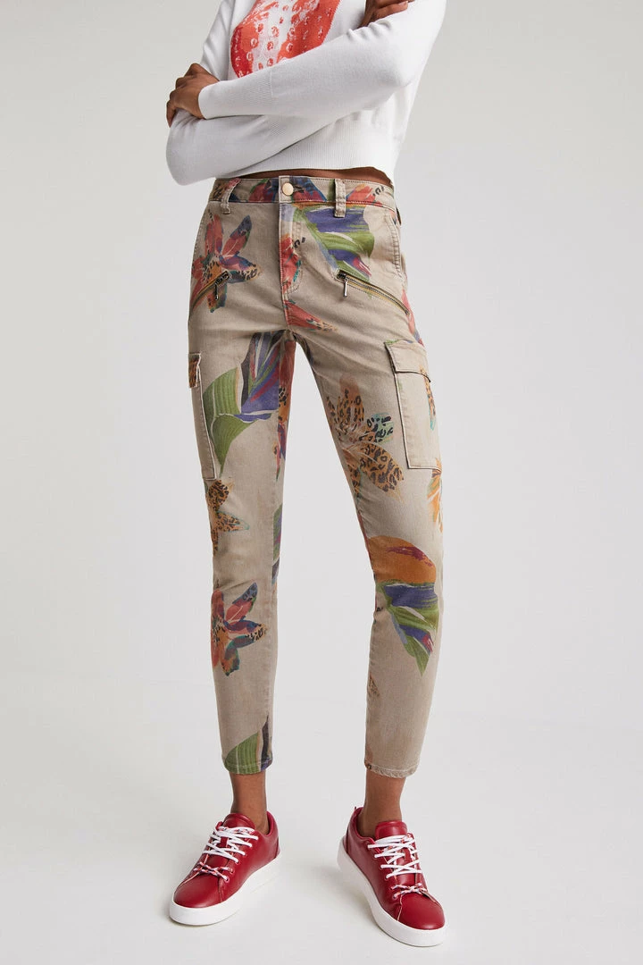 Khaki overdyeing featuring a camoflower print and large side pockets. Very comfortable skinny cargo trousers. Made from sustainable cotton.