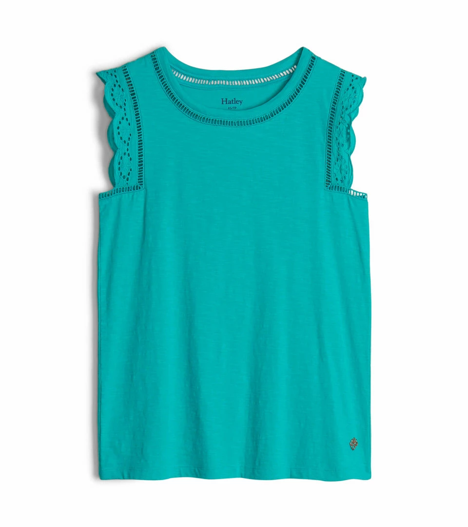 Structured yet delicate looking, this must-have tank with embroidered sleeves and lace inserts around the collar and armholes is a perfect pick for just about any adventure – from brunch with friends to leisure days on vacation.
