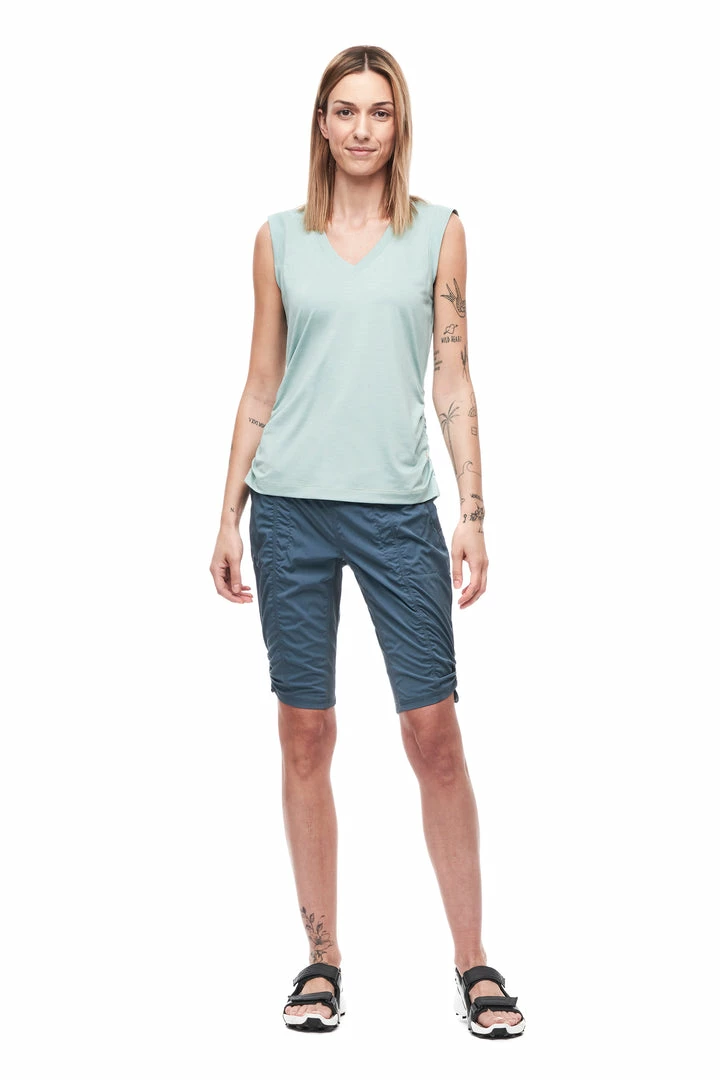 The DIPORTO t-shirt is made of Quick Dry Knit, a light mesh fabric with a Polygiene® finish. Polygiene permanent odor control stops growth of odor-causing bacteria on fabrics, so you can wear more and wash less. You can also have the possibiliy to tie a knot at front of the top which can give you a more fashionable look while remaining useful for your outdoor activities. These features make this top versatile, great for travel and various outdoor activities.