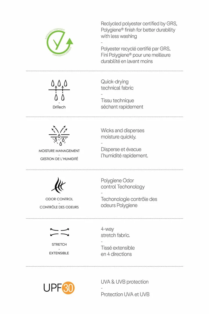 Fabric : 93% Recycled Polyester, 7% Spandex , 165g/m2, Polygiene® Finish, GRS Approved