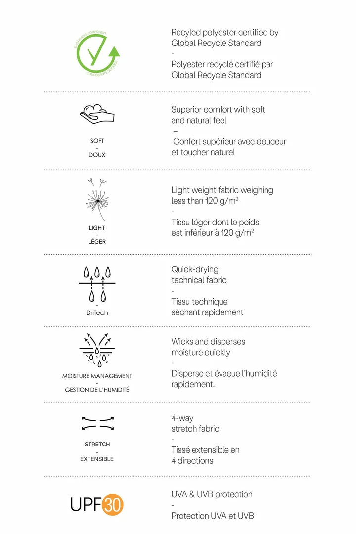 Fabric : 88% Recycled Polyester, 12% Spandex, 92g/m2, GRS approved