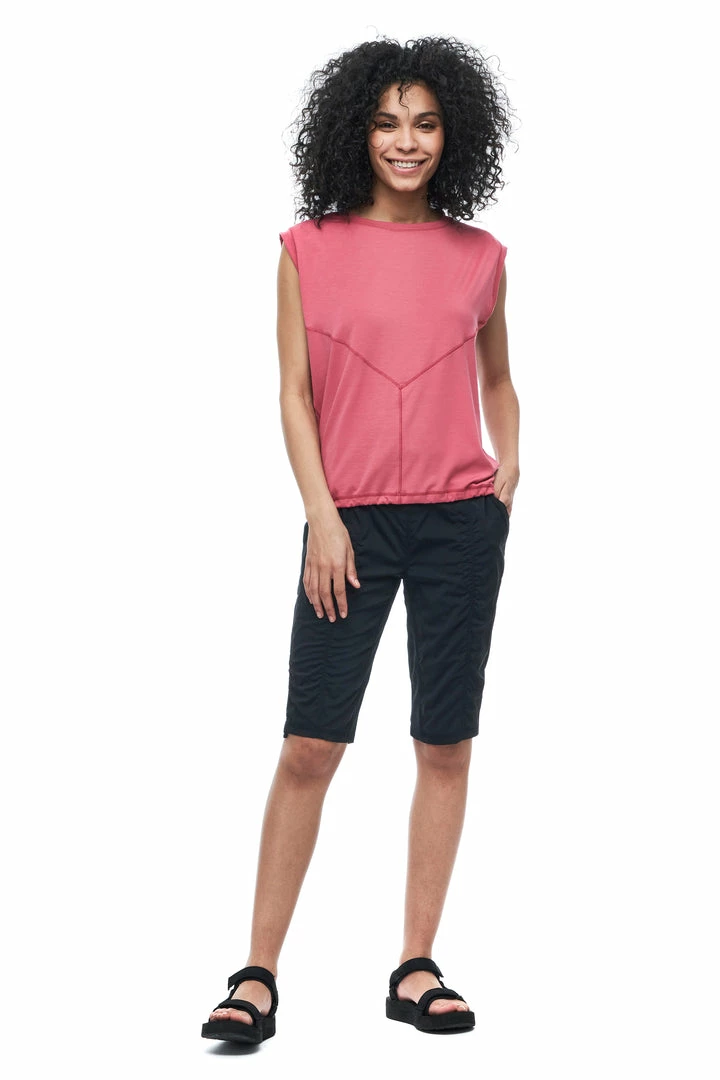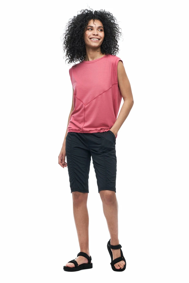 The GOMA sleeveless top is made from fabric containing Lyocell, a cellulosic fiber made of wood pulp obtained from sustainable forests. Partially eco-friendly, drirelease® Lyocell ensures long-term fabric performance and maintains its softness after wash. It has moisture-wicking and fast drying properties, which minimizes odours and maximizes comfort and has a UPF rating 30+. These features make this top versatile, great for travel and various outdoor activities.