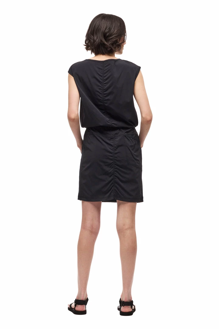 The LACO II dress is made of woven stretch fabric that is light, strong, and 2-way stretch. The weave offers ease of movement, dries quickly, wicks moisture and has a UPF rating 50+. The LACO dress can be adjusted at the waist to give a slightly more belted look at the waist, while maintaining the sporty look.These features make this dress versatile, great for travel and various outdoor activities.