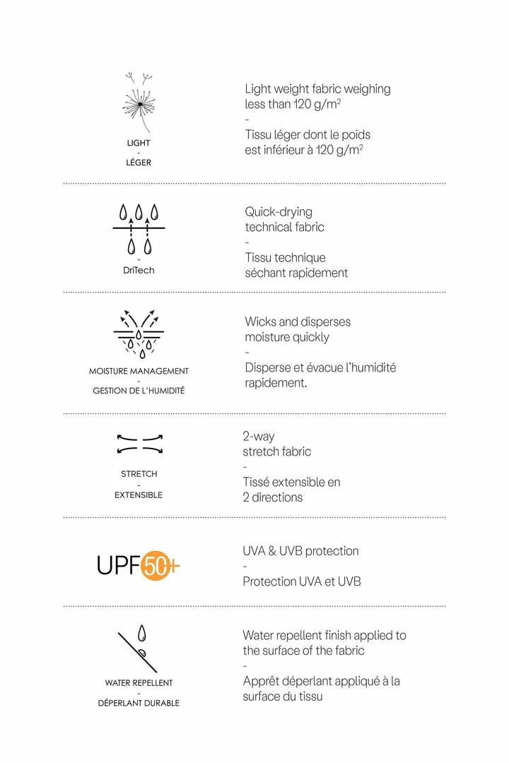 Fabric : 94% Nylon, 6% Spandex, 105g/m2, wicking finish