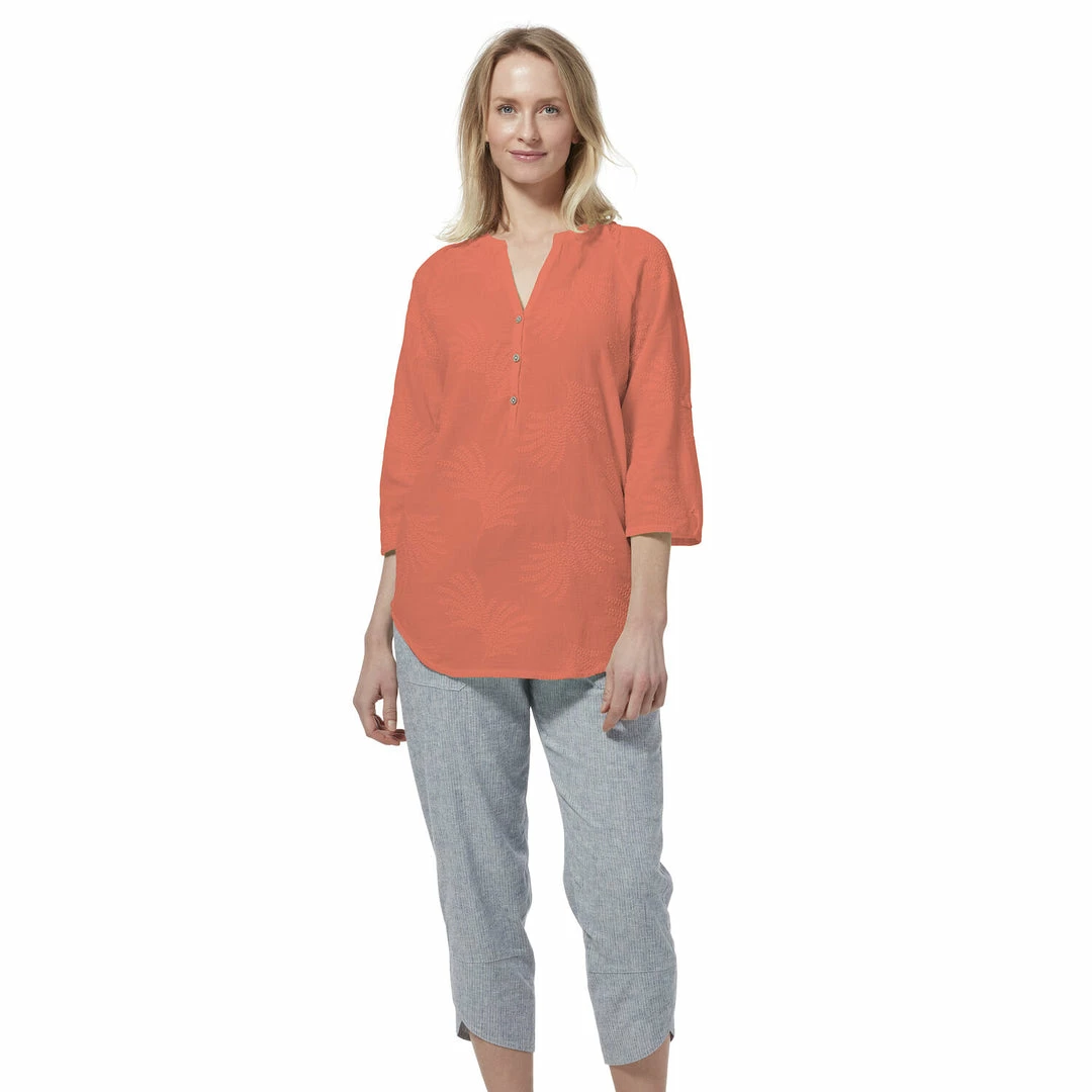 Soft, breezy cotton travel top that pairs perfectly with leggings or jeans. The crepe woven fabric lets cool air through and the soft cotton gets even softer over time. Pleated back adds style.