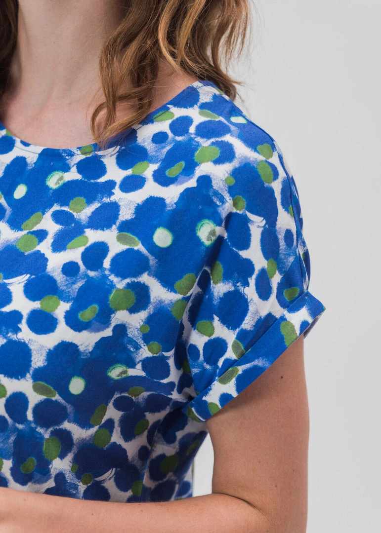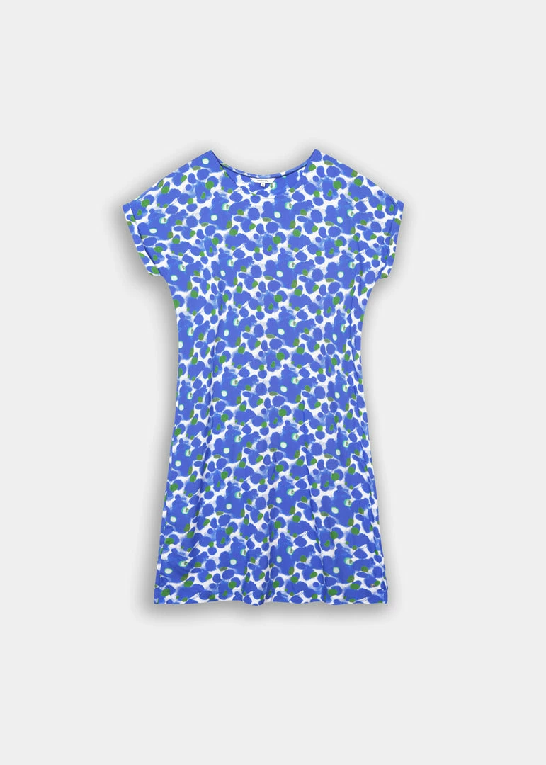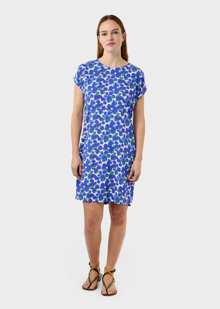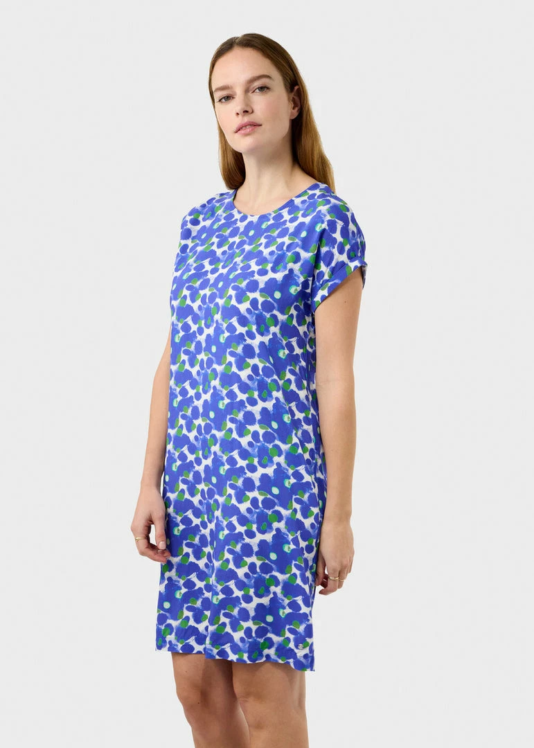 The perfect dress for spring! This dress wears comfortably and feels soft, crisp and airy. The dress hits at the knee, has short sleeves and a feminine round neck.