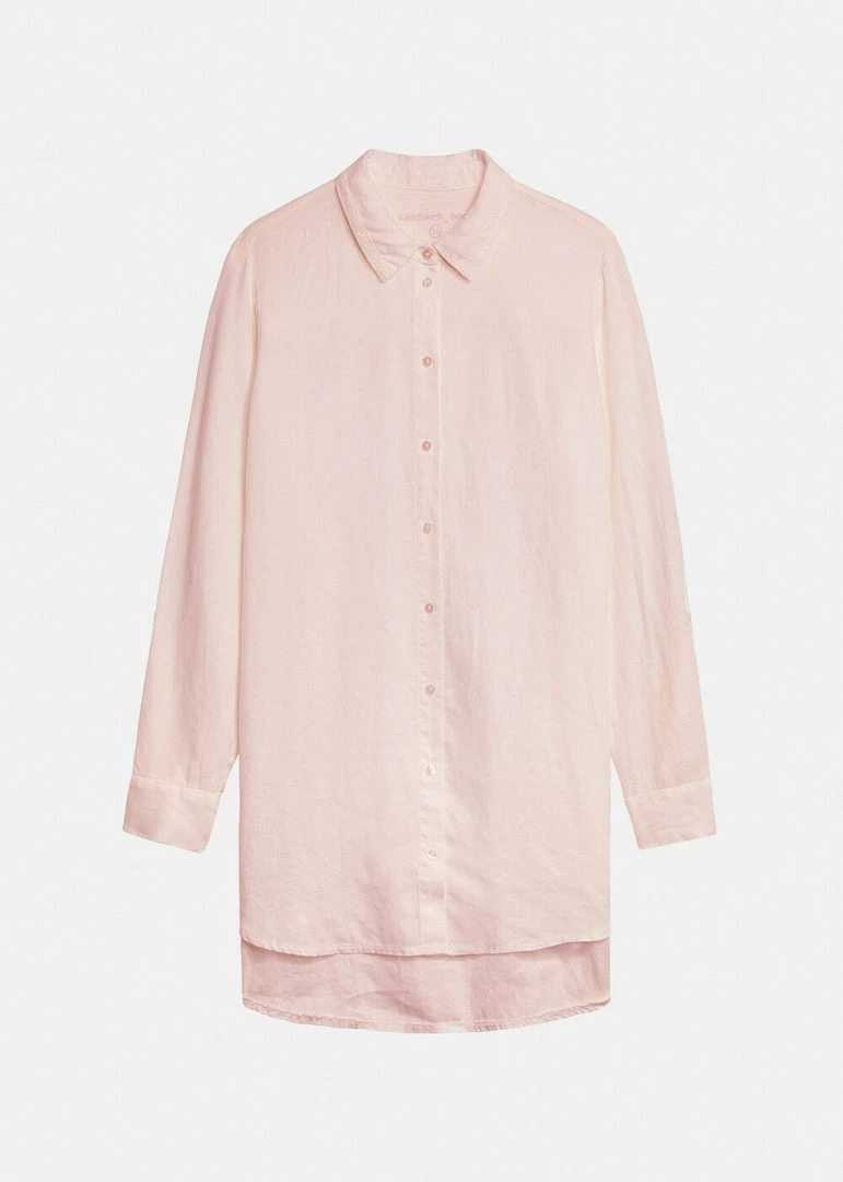 This airy linen blouse is a great basic piece. The back is slightly longer than the front. The blouse features long sleeves that can be rolled up.