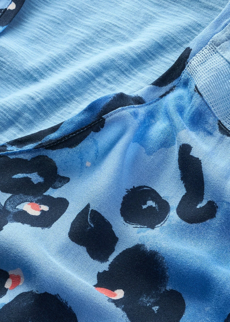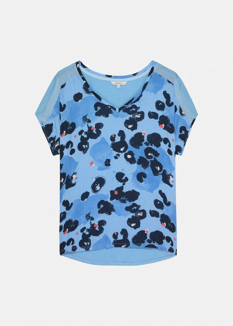 Top with graphic print on the front. The top has short sleeves that are turned up, a round neckline and a monochrome back panel.