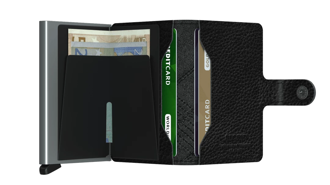 The patented mechanism allows you to slide out your cards with one simple motion, ready for immediate use. The aluminium protects from bending, breaking and unwanted wireless communication.