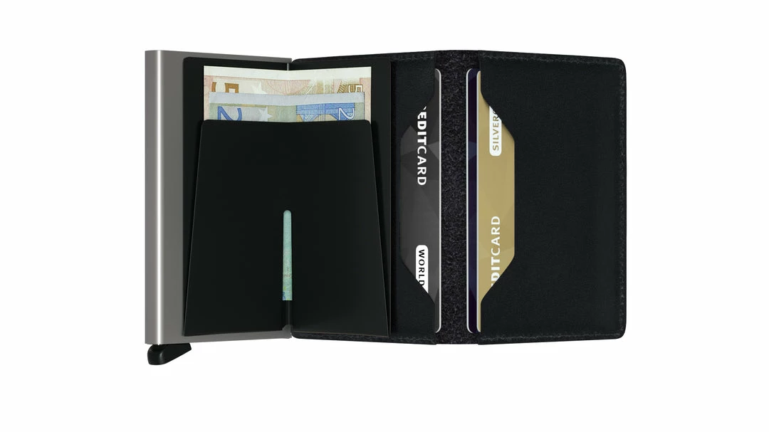 The patented mechanism allows you to slide out your cards with one simple motion, ready for immediate use. The aluminium protects from bending, breaking and unwanted wireless communication.