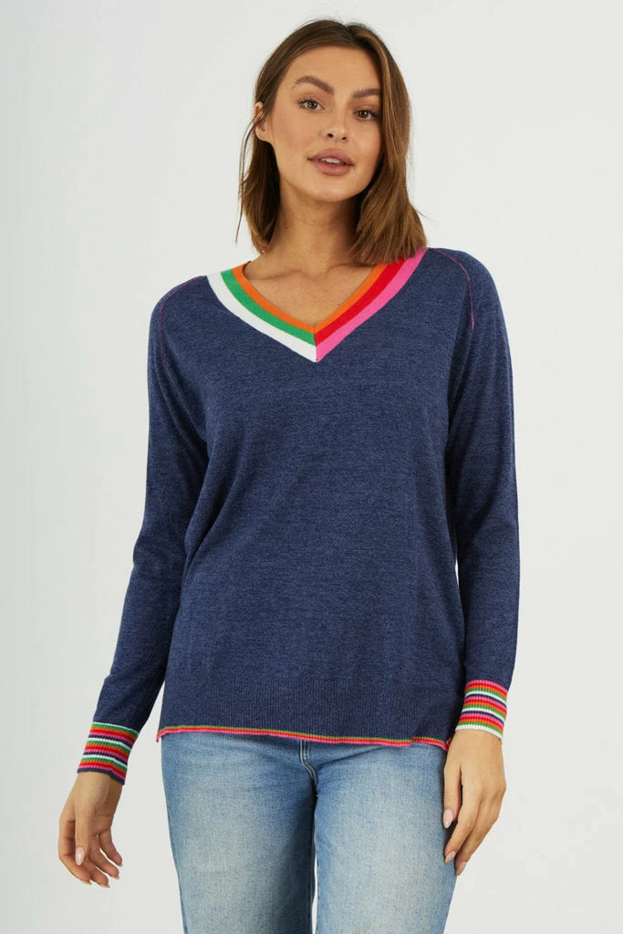 A fun v-neck sweater with split ribbed hemline. This soft and comfortable sweater has a relaxed fit with colour pop accent.